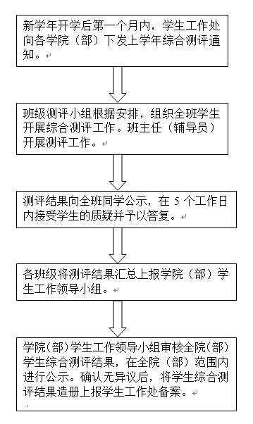 第五条 综合测评每学年进行一次,毕业学年不进行综合测评。综合测评工作程序依次为:本班级学生互评、班级测评小组测评、班主任(辅导员)测评、学院(部)测评领导小组审定。其结果要在班级、学院(部)、学校范围内公示,以确保测评结果的合理性和公正性。若学生对测评工作有疑义,从公示之日起,可在5个工作日内向班主任、辅导员、主管学生工作的院(部)领导或学生工作处反映。