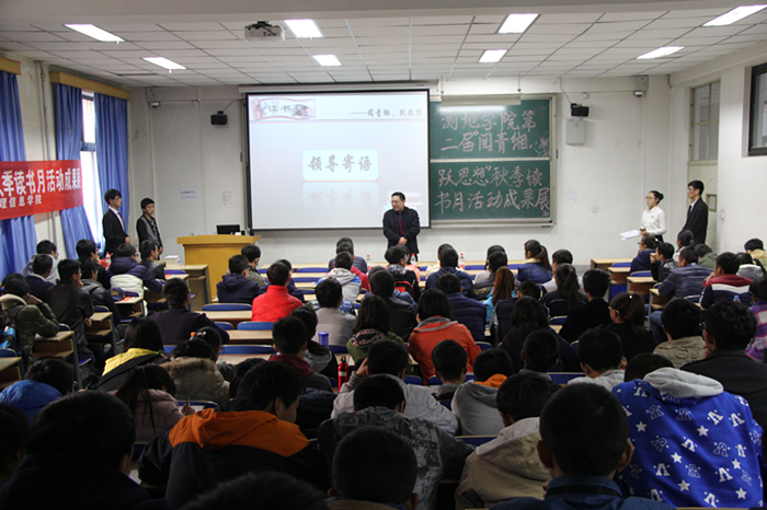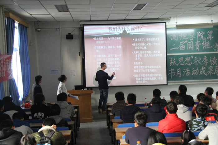 11月26日下午,测绘与地理信息学院2015秋季读书月成果展示暨闭幕式在8教1507教室隆重举行,学院书记李仲勤老师、副院长金江磊老师、团委书记曹铎老师出席闭幕式。