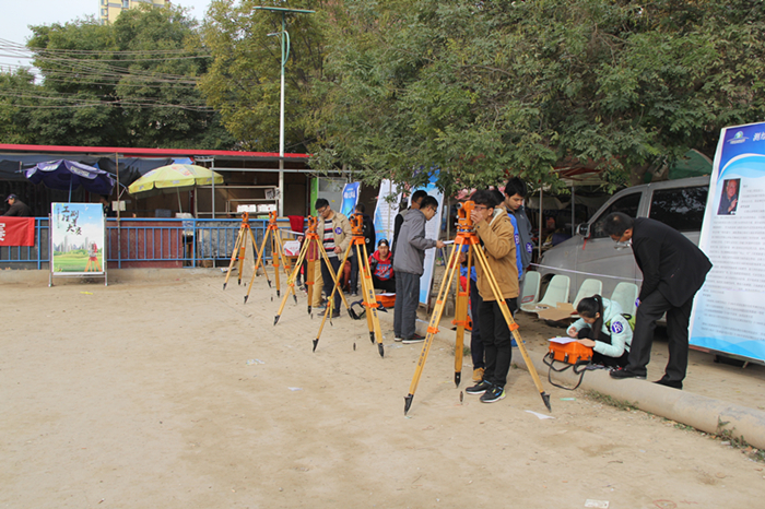 这次比赛延续上届改制后的新赛制,分为专业A组、专业B组和非专业组,不同组别分别进行导线测量、水准测量和水平角观测等项目,每个项目又包括仪器操作测量环节和数据处理环节。比赛内容更加细分化,组织评审更加专业化是这届比赛的一大亮点。上午8点30分,举行了简短的开幕式,随后在专业老师和学生会志愿者的组织协调下,比赛从早上9点半正式开始,持续到下午5点结束,所有参赛队伍顺利完成全部比赛项目,整场比赛严肃、紧张、有序。