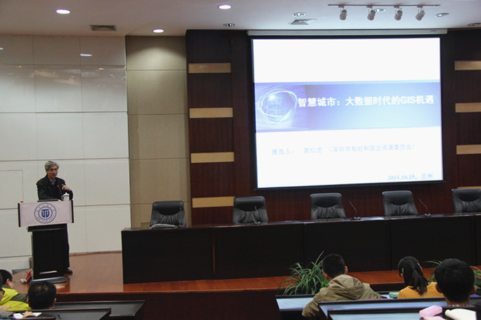 10月15日上午,中国工程院院士、地理信息工程专家郭仁忠教授来访我校,并在国际会展中心作了题为《智慧城市:大数据时代的GIS机遇》的学术报告。测绘与地理信息学院及校内外300余名师生参加了报告会。报告会上,郭院士以城市问题的复杂性和智慧城市的本质特征引入论题,从“大数据时代”“智慧城市建设中的GIS挑战”“大数据结合GIS的基本应用”“城市规划的业务重构”等几方面结合大量实例进行了精彩的阐述,对智慧城市建设过程中存在GIS技术壁垒、待解决的前沿性问题做了深入分析。在提问交流环节,郭院士就师生们提出的关于“城市规划中大数据更新”“城市规划中通过大数据提高公众和媒体的参与度”和“大数据在国内外的应用进展”等问题做了精辟的解答。我院闫浩文院长主持了报告会。