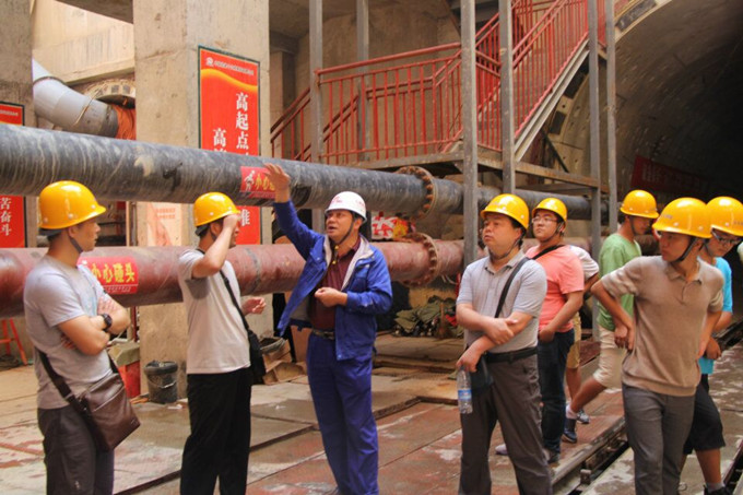 迎门滩至马滩区间由中铁十六局承建,右线长1906.567米,左线长1908.029米,区间由迎门滩出站,为躲避银滩大桥桥桩,线路采用双线单侧绕避措施、纵断面压深线路纵坡、从黄河底部以下卵石层中穿行,下穿黄河段长度约404米。盾构法施工是一大亮点,盾构机采用世界上最先进的泥水加压技术。同学们通过认真听相关负责人的讲解、观看相关内容的视频、进入正在施工的隧道中参观,深入了解该段地铁的建设进程,并在内心深处萌生了对地铁建设者的尊敬和感谢。