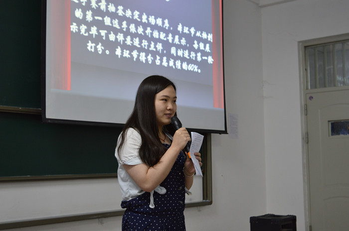 决赛分为三个环节,第一环节由七组选手分别为自己准备的材料配音,其中第二组选手的游戏人物配音得到了在场同学的广泛好评。第二环节为现场互动环节,主办方精心准备的一段网络视频剪辑,由现场观众体验配音的魅力,现场观众的即兴配音显得别具特色。在轻松愉快的气氛中,比赛迎来了第三环节,本环节由赛事主办方提供了包括动漫,影视,网络短片和记录片四大块的视频剪辑,选手任选一项进行现场配音。这一环节主要考验了选手的临场发挥能力。最终来自外语学院第七组选手获得本次比赛的冠军。