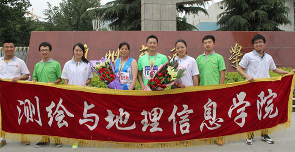 赛后,学院马拉松赛志愿者手捧鲜花在校门口迎接凯旋的胡老师和乔老师,并与两位老师合影留念。胡老师和乔老师为学院学生做出了表率,激励测地学子在今后的学习生活中以运动陪伴健康生活,以毅力引导青春远航。
