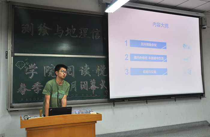 书籍是人类进步的阶梯, 读书一直是我院领导和教师大力推崇的优秀的文化活动。我们相信,在老师的督促和同学们的自觉下,读书会成为每名测地学子的良好生活习惯,让书香带给我们的幸福洋溢在每名测地学子的脸上。(作者: 杨帆)