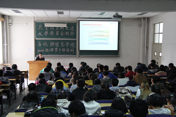 2014年11月21号下午,测绘与地理信息学院团委组织的2014年团干部培训在八教A座1511进行了第一讲团课。参加本次培训有测地学院团委学生会、青年志愿者协会、地理爱好者协会的全体学生干部和14级各团支部支部委员,根据校团委安排,团课邀请到了校团委副书记王娜老师主讲。