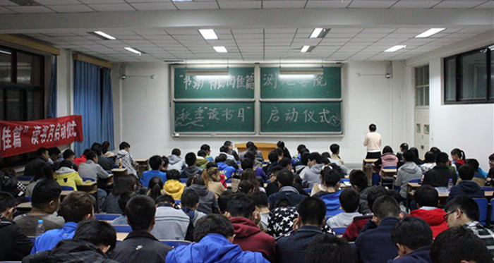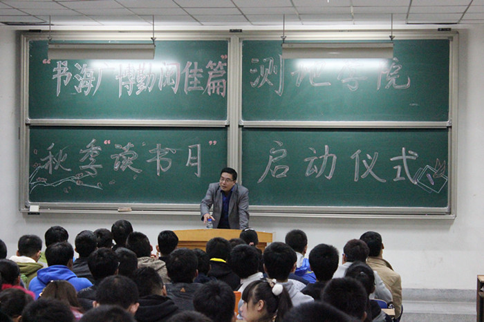 测地学院读书月计划每年春季、秋季各举行一次,本次秋季读书月活动包括“启动仪式”、“名著电影展”、“参观省博物馆”、“图书募集漂流”、“读书心得交流会”五个部分。启动仪式上,院党委书记李仲勤老师对本次活动寄予了殷切期望,并对我院学生干部提出了几点建议,他要求学生干部要借助读书的力量充实自己、提升自己,在大学阶段尽可能的培养自己的读书兴趣和学习能力,带头推进学院的学风建设,得到了在场学生干部普遍认同。活动结束时,到场的老师和同学们共同在“书海广博,勤阅佳篇”的横幅上签上了自己的名字。
