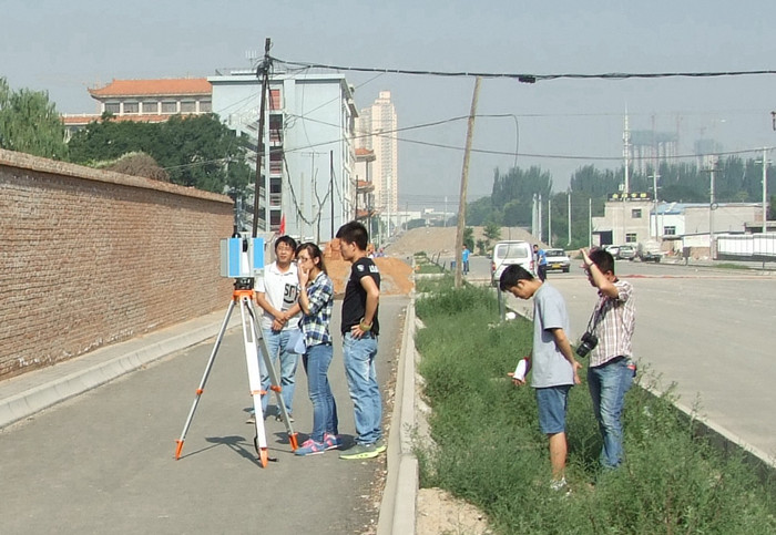 活动中,厂家技术人员和我院师生共同采用Z+F IMAGER 5010C三维激光扫描仪,现场完成了0.6 km的道路测量工作。通过对该区域29站全方位的三维激光扫描,高分辨率快速完成了数据获取,并基于点云数据生成DLG及三维成果;提取了道路特征参数及土方量等精确数据,测试精度可达3mm,这对于工程应用及监测等领域有极大吸引力。期间,我院师生全程参与了控制点测量、扫描仪操作和数据处理等环节,同时就软件的使用做了更为详细的交流,并一致认为该技术在测绘等领域必将有广阔的应用价值,是继GPS技术之后的又一次技术革命。