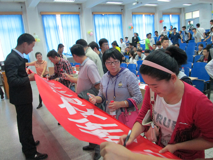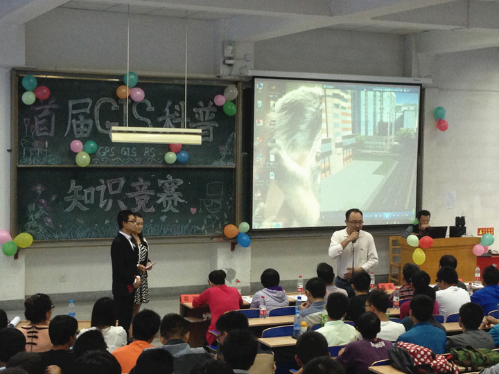 活动伊始,由孙建国副院长致开幕词。他指出地理爱好者协会创办之宗旨与使命,并祝福地理爱好者协会能够不断发展壮大,远景辉煌。随后,激烈的竞赛活动正式开始。竞赛分为“有问必答”与“险中求胜”两关,参赛选手使出浑身解数,积极答题,层层角逐,比赛气氛十分活跃。比赛间隙,会议组织者还穿插了魔术表演和抽奖环节与观众互动交流。活动最后,与会嘉宾与在场观众举行了签字仪式,并把各自对GIS的美好祝福写在了活动条幅上。