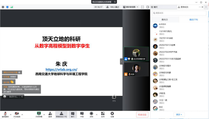 9月15日,学院邀请了西南交通大学地球科学与环境工程学院朱庆教授为2022级本科新生在线讲授《测绘科学导论》课程,这是2022级新生大师进课堂系列首次讲座,朱庆教授为广大师生作了主题为“顶天立地的科研—从数字高程模型到数字孪生”的线上学术讲座。学院300余位师生参加了在线学习并积极互动交流。讲座由学院副院长刘涛教授主持。