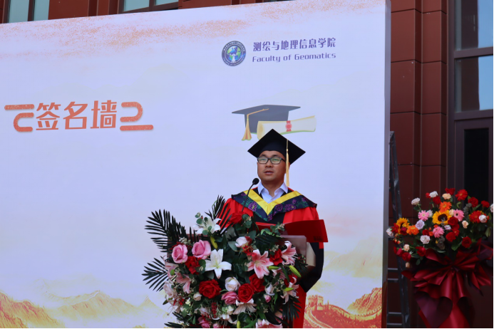 何毅教授作为教师代表为同学们送上祝福,他希望测地学子保持谦虚心态,坚持不懈,不畏艰难,迎接挑战,坚定信念,带着使命和责任,在强国建设、民族复兴伟业中实现自己的价值。