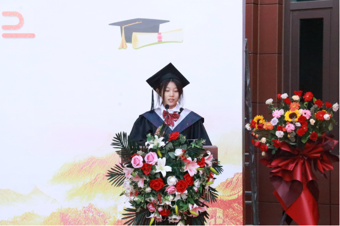 刘文蕊同学作为研究生毕业生代表发言, “三尺讲台度春秋,挥洒青春育桃李,在此向为我们的成长倾注了无数心血的老师们道一声感谢,谢谢你们,正是你们的言传身教,无私奉献,换来了我们今天的收获与成长” ,她回顾了三年来随着学院的发展自己在科研道路上的不断进步,并深情表达了对母校、学院和恩师的感谢,祝愿母校蒸蒸日上,更续辉煌!