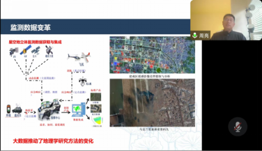 随后,讲座就地理学研究技术方法进行了讲解。由传统地理学方法的局限性到现代地理科学发展,再到最新的AI科学,周老师讲述了监测数据变革,强调是大数据推动了地理学研究方法的变化,既要继承传统地理学,又要拥抱大数据和AI技术,同时告诉同学们不要忽视小数据,要根据具体问题选择研究数据与方法。