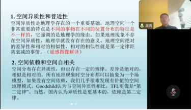 讲座围绕地理科学发展趋势与新技术开展。首先,周老师讲述了地理学的发展,由地理学第一定律引入,讲解了空间异质性和普适性、空间依赖和空间自相关、空间交互和距离衰减效应、空间聚合与尺度效应等地理学中的重要概念和议题。