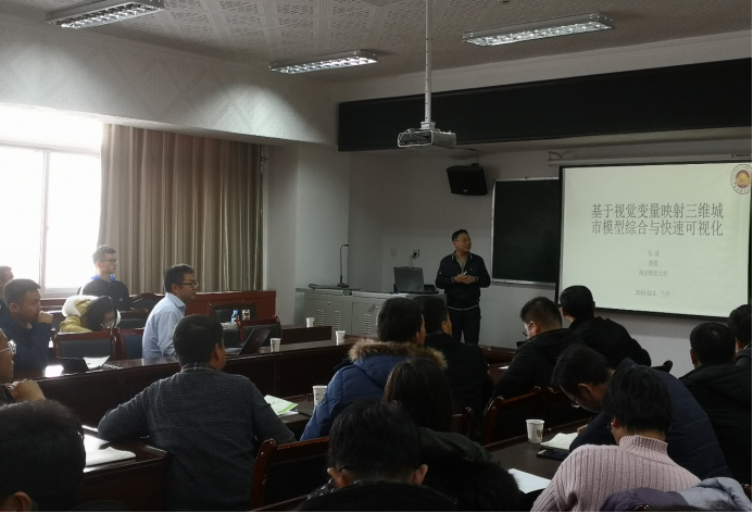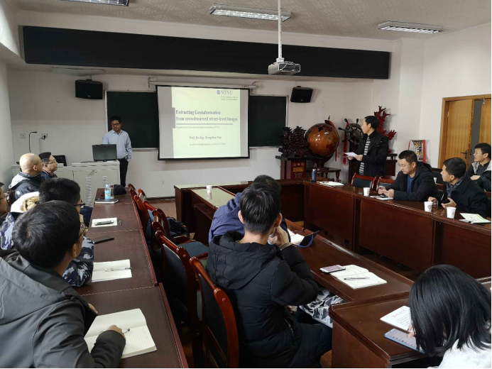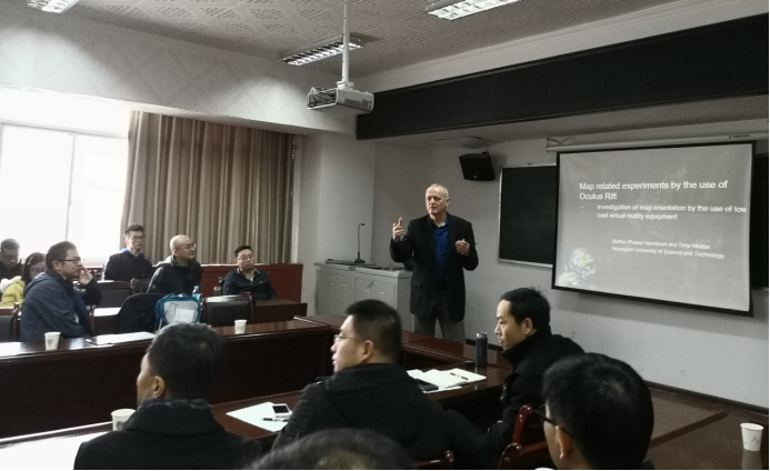 12月1日上午9点, Terje Midtbø教授、范红超教授、毛波教授分别作了题名为“Education and examples on research at the Norwegian University of Science and Technology:Virtual reality and map experiments, influence of background map”、“Extracting GeoInformation from crowdsourced street level images”、“基于视觉变量映射三维城市模型综合与快速可视化”的学术报告。报告后三位教授与学院教师和硕、博士研究生就科学研究方向、深度学习、三维建模等进行了深入的交流和热烈的讨论。刘涛副院长主持报告会。