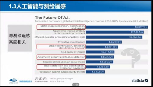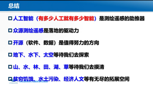 讲课中,杨必胜教授从人工智能、感知-智能硬件、认知-智能软件和决策-智能服务四个方面做了详细的阐述。针对人工智能的起源,主要讲解了人工智能的发展过程,人工智能与测绘遥感的关系及其在测绘领域的重要应用等。在感知-智能硬件方面,重点讲解了小卫星星座、无人机、无人机激光扫描系统、无人机群智/协同和安全辅助/无人驾驶等的发展趋势。在认知-智能软件方面,系统地诠释和刨析了深度学习、多机协同测图及智能算法的相关研究现状。在决策-智能服务方面,通过叶绿素荧光卫星遥感、极地遥感、海岸带海岛礁测绘遥感、城市不透水面遥感制图、全息测绘和电力无人机遥感安全检测等典型案例的讲解,分析了目前研究的热点和趋势。