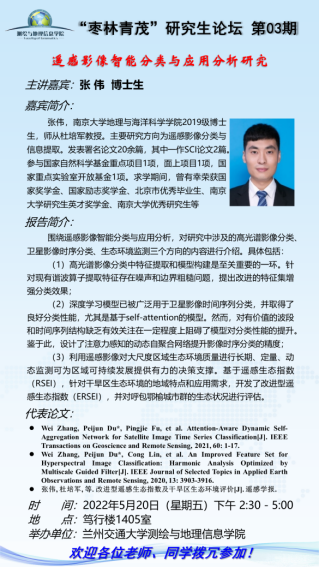 南京大学张伟博士作了题为《遥感影像智能分类与应用分析研究》的报告。报告围绕遥感影像智能分类与应用分析,对研究中涉及的高光谱影像分类、卫星影像时序分类、生态环境监测三个方向的内容进行详细介绍。