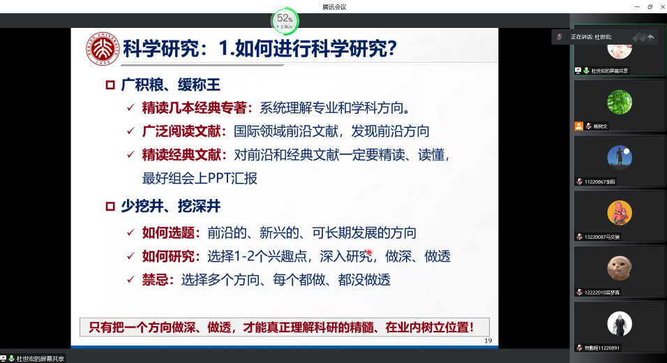 接下来,杜教授从科研选题、文献学习、研究阶段和科研总结四个方面详细讲述了如何从老师的角度培养学生独立思考、凝炼科学问题的能力以及从学生的角度举例探讨了如何配合老师培养科研意识和独立从事科研的能力。
