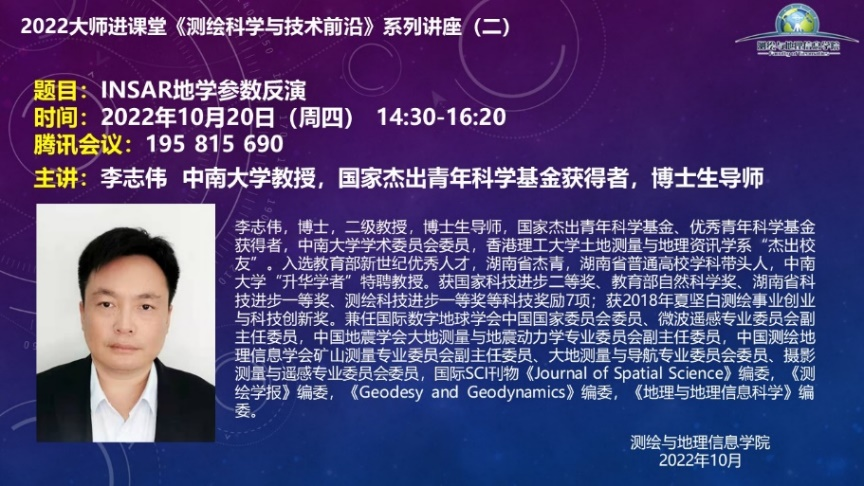 2022年10月20日下午14:30-16:20,应学院邀请,国家杰出青年科学基金获得者、中南大学教授、博士生导师李志伟教授采用线上方式为我院2022级研究生讲授《测绘科学与技术前沿》课程,这是我院大师进讲堂系列讲座之一。本次讲座的主题是:“InSAR地学参数反演”,学院部分老师和研究生共200余人参加了在线学习和交流。讲座由杨树文教授主持。