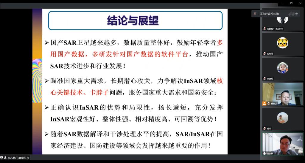 最后,李志伟教授从国家需求出发分析了目前对于InSAR技术的需求体现在哪些方面,鼓励年轻学者多用国产数据,多研发针对国产数据的软件平台,瞄准国家需求,力争解决InSAR领域核心关键技术、卡脖子问题。