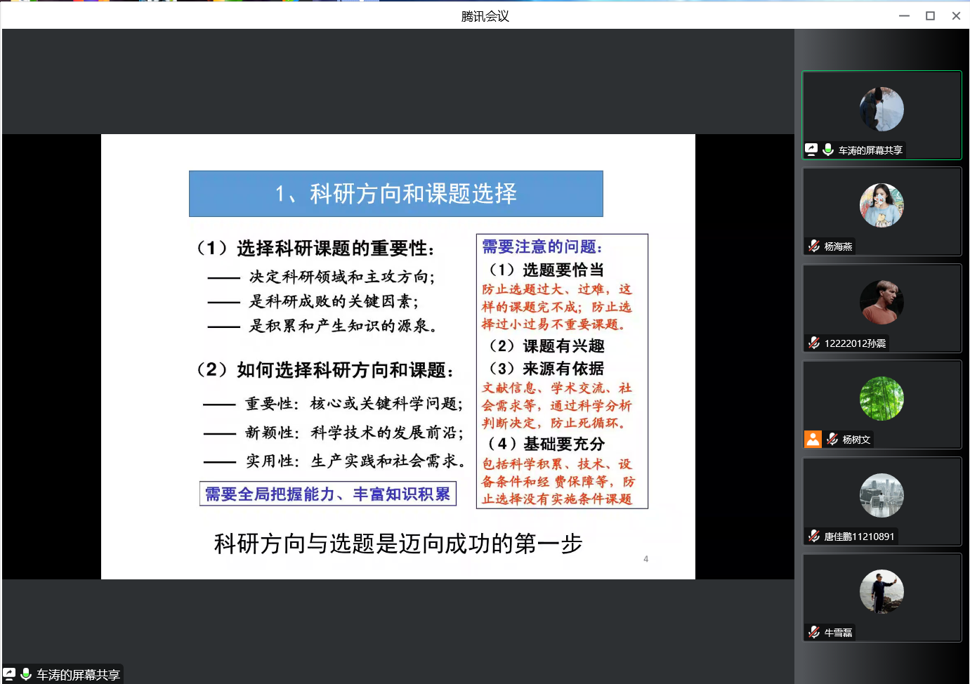 本次讲座主要包括科研方向和课题选择、信息收集和阅读文献、研究思路和实验设计、证据收集和结果分析以及归纳总结五个部分。在报告开始之初,车老师就语重心长指出年轻人不要好高骛远,要脚踏实地,踏踏实实的做科研。紧接着,从科研方向与选题的重要性出发,详细介绍了选题需要注意的问题,并建议学生应多与导师交流,确定好自己的研究方向。