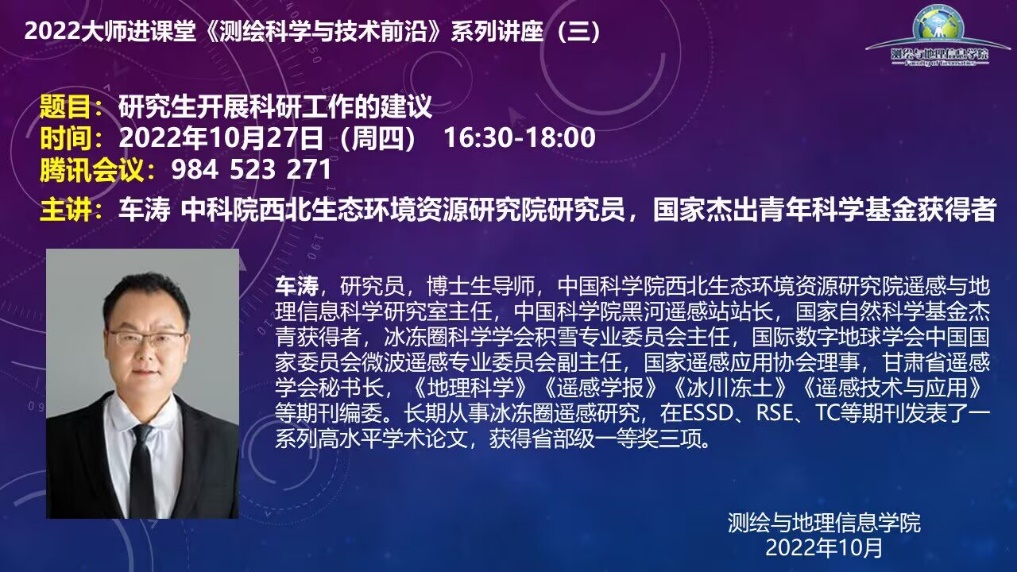 20221027日下午1630-1800,应学院邀请,中科院西北生态环境资源研究院研究员、国家杰出青年科学基金获得者车涛老师采用线上方式为我院2022级研究生讲授《测绘科学与技术前沿》课程,这是我院大师进课堂系列讲座之一。本次讲座的主题是:研究生开展科研工作的建议,学院部分老师和研究生共160余人参加了在线学习和交流。讲座由杨树文教授主持。