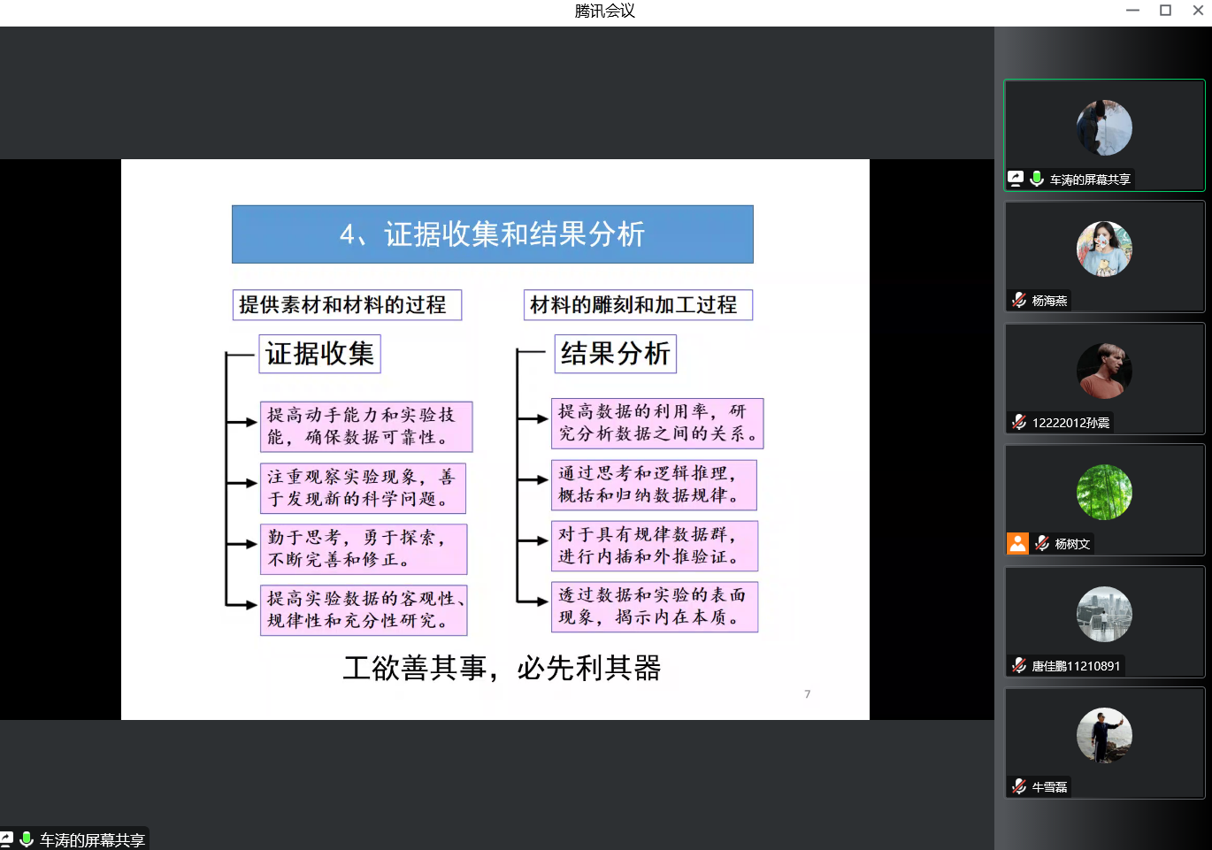 接下来,车老师从文献阅读、研究方法、结果分析和归纳总结四个方面详细讲述了研究生如何开展科研工作以及学习中需要注意的问题,强调了信息收集和阅读文献的重要性,避免闭门造车,走弯路。九层之台,起于累土,研究生新生应在阅读文献的过程中夯实专业基础,搭建自己的知识体系,并寻找创新思路。另外,车老师还强调了一点,工欲善其事必先利其器,要进行科学研究,必定要有一些良好的工具,诸如编程能力、软件操作等。在归纳总结时,车老师提出两点,其一在撰写论文时,同学们应先力求完成,再精益求精,逐步写出优质论文。其二,同学们应以天道酬勤为座右铭,努力达到作为一名研究生应达到的要求,即会做实验、会读文献、会写论文。