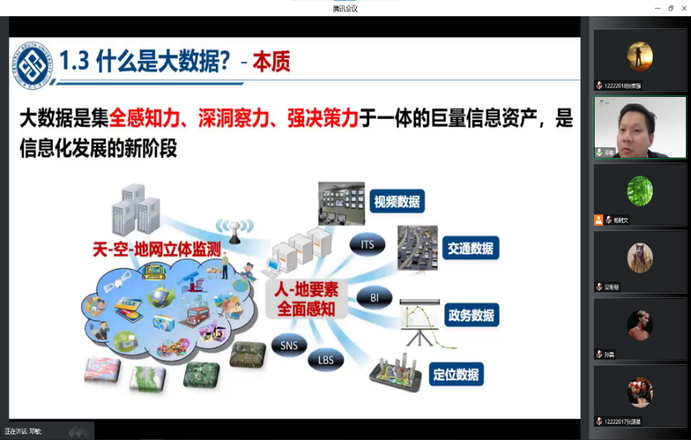 讲座内容主要包括时空大数据的内涵、特征、作用以及小结四部分。首先,邓老师从数据的定义、大数据产生的时代契机、大数据的定义、大数据在中国的发展、时空大数据是大数据的核心以及时空大数据的精髓这六个方面详细地阐述了时空大数据的内涵,并通过大量的实例使抽象的知识更加浅显易懂。
