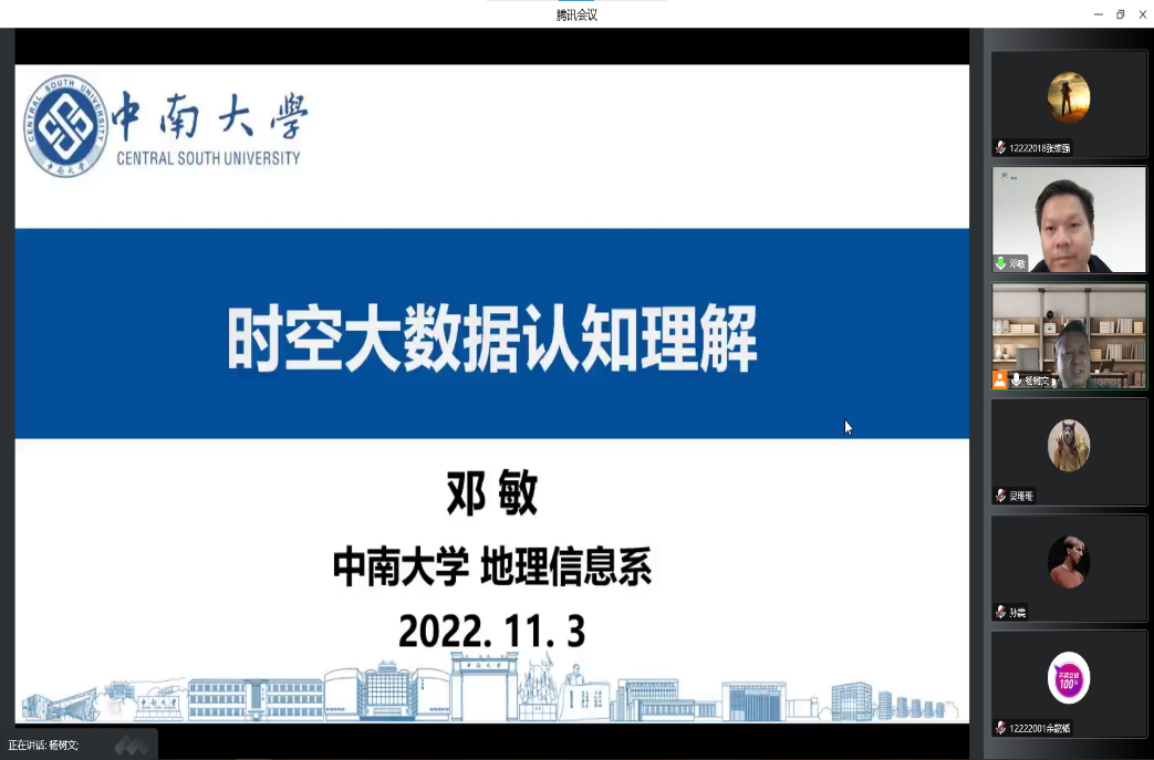 2022年11月3日下午14:30-16:30,应学院邀请,中南大学教授、国家级xx特聘教授邓敏采用线上方式为我院2022级研究生新生讲授《测绘科学与技术前沿》课程,这是我院大师进课堂系列讲座之一。本次讲座的主题是“时空大数据认知理解”,学院部分老师和研究生共210余人参加了在线学习和交流。讲座由杨树文教授主持。
