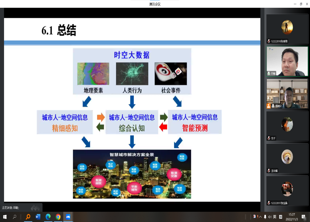 最后,邓教授针对本次讲座进行总结并提出展望,提出了空间大数据研究待解决的一些问题,并给今后可能从事此方向的研究生提出了一些建议。