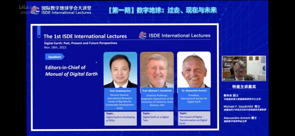 2022年11月18日,我院组织2022级研究生新生在线观看了国际数字地球学会大讲堂第一期:数字地球:过去,现在与未来。本次主讲人为:可持续发展大数据国际研究中心主任,郭华东院士;美国加州大学圣巴巴拉分校地理系名誉教授,Michael F.Goodchild院士和国际数字地球学会主席,Alessandro Annoni博士。本次大讲堂由Prof.Milan Konecny主持。