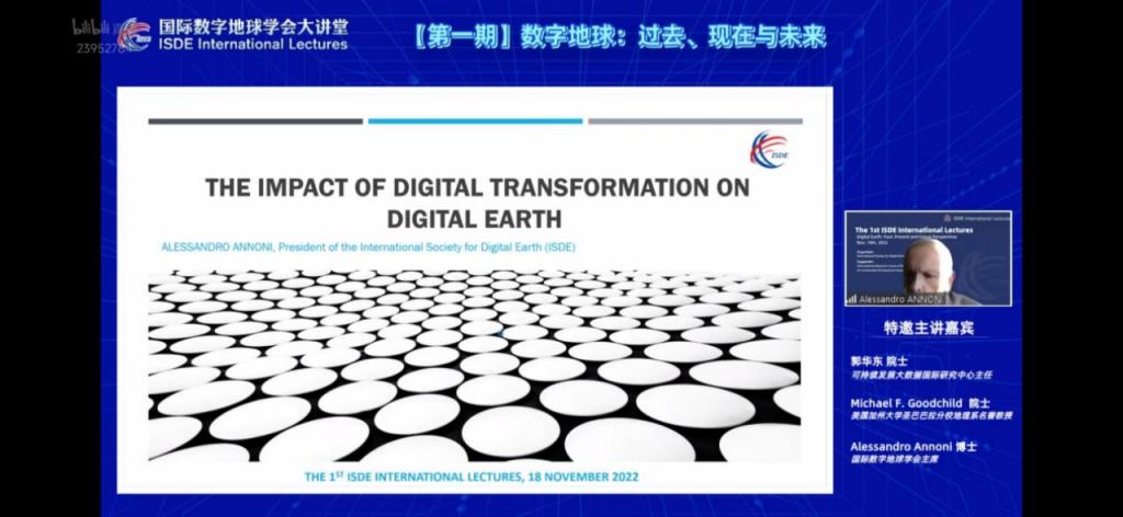 Alessandro Annoni博士针对“数字化转型对数字地球的影响”等阐述了数字转型对数字地球的重要性,着重讲解了数字通道(包括连接的设备)、数字治理以及数字孪生革命、数字分析演变和数字地球的前景和发展趋势。