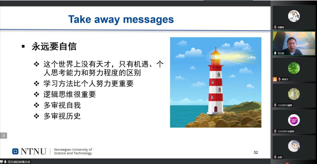 最后,范教授指明研究生学习要自信,世界上没有绝对的天才,只有机遇、个人思考能力和努力程度的区别。学习方法比个人努力更重要,要注重逻辑思维的培养,多思考,多钻研。