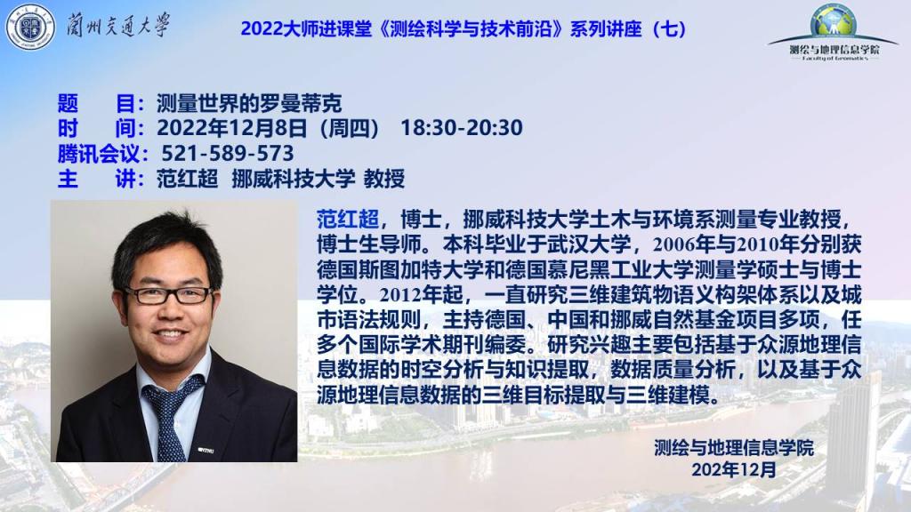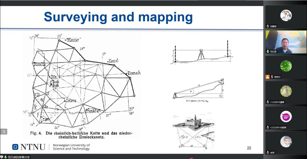 2022年12月8日晚上18:30至20:30,应学院邀请,挪威科技大学土木与环境系测量专业教授、博士生导师范红超教授采用线上方式为我院2022级研究生新生讲授《测绘科学与技术前沿》课程,这是我院大师进课堂系列讲座之一。
