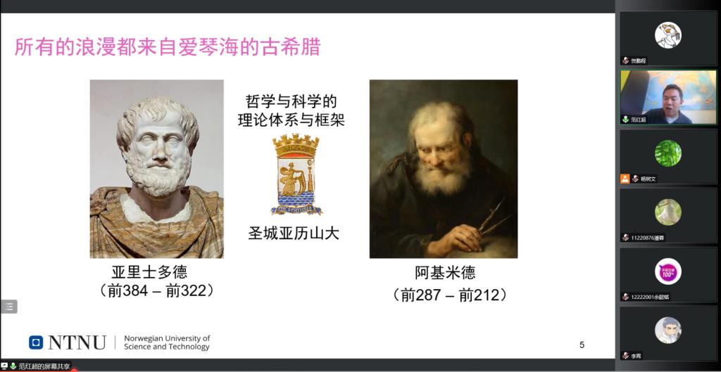 讲座中,范红超教授指出任何学科的发展都是非常浪漫的,其中有很多必然和偶然的因素在里面,回头审视某段历史的时候,才能体会到科学为什么是这样的发展的,才会让人对其中的方法、理论理解更深刻,对自己未来的规划更加自信。讲座以中国古代名家庄子、老子和古希腊的亚里士多德、阿基米德等为例,以古代欧洲与中国进行对比,阐明要想让科学的种子生根发芽并形成相应的理论体系和框架,必须要善于观察、善于思考并且要有钻研到底的精神。