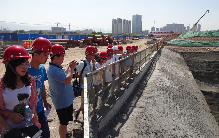 7月25日下午,顶着炎炎烈日,兰州交通大学测绘与地理信息学院2014年暑期社会实践团在副院长韩峰、团委书记曹铎的带领下一起来到位于安宁区的中铁建兰州市城市轨道交通1号线一期工程试验段进行社会实践。兰州轨道交通李总工程师带领实践团一行对项目工地进行了现场参观实践。