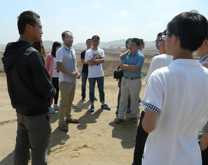 在接下来的参观中,兰州新区土地资产投资管理有限公司经营管理部孙磊带领实践团一行来到重庆聚能建设集团兰州新区项目部。在项目部工地,同学们现场观看了对新区范围内低丘缓坡荒漠等未利用土地的平整的过程,并对此过程中所能遇到的测量及地理信息问题向院长韩峰老师踊跃提问,韩老师用风趣幽默的回答不仅解决了问题更对同学们提出了勉励,整个参观过程气氛热烈。