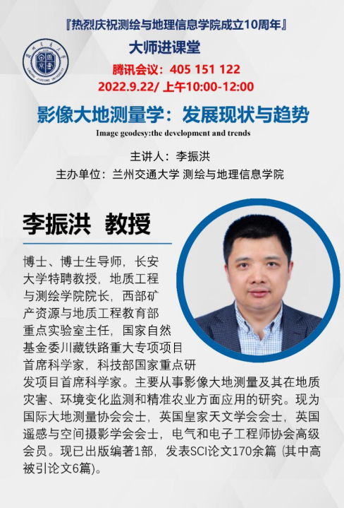 9月22日,学院邀请了长安大学地质工程与测绘学院院长李振洪教授为2022级本科新生在线讲授《测绘科学导论》课程,这是2022级新生大师进课堂系列讲座之一,李振洪教授为广大师生作了主题为“影像大地测量学:发展现状与趋势”的线上学术讲座。学院300余位师生参加了在线学习并积极互动交流。讲座由学院副院长刘涛教授主持。