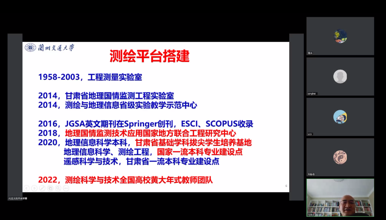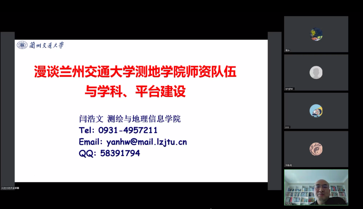 在专题四:新时代地理信息科学专业师资队伍能力建设研讨会中,闫浩文教授做了《漫谈兰州交通大学测地学院师资队伍与学科、平台建设》的专题报告。报告中介绍了兰州交通大学测地学院的创办与学科发展,师资队伍建设与教学科研平台相辅相成的关系,最后对欠发达地区如何留住人才,个人与学科、平台的关系等关键核心问题给出了自己的思考。