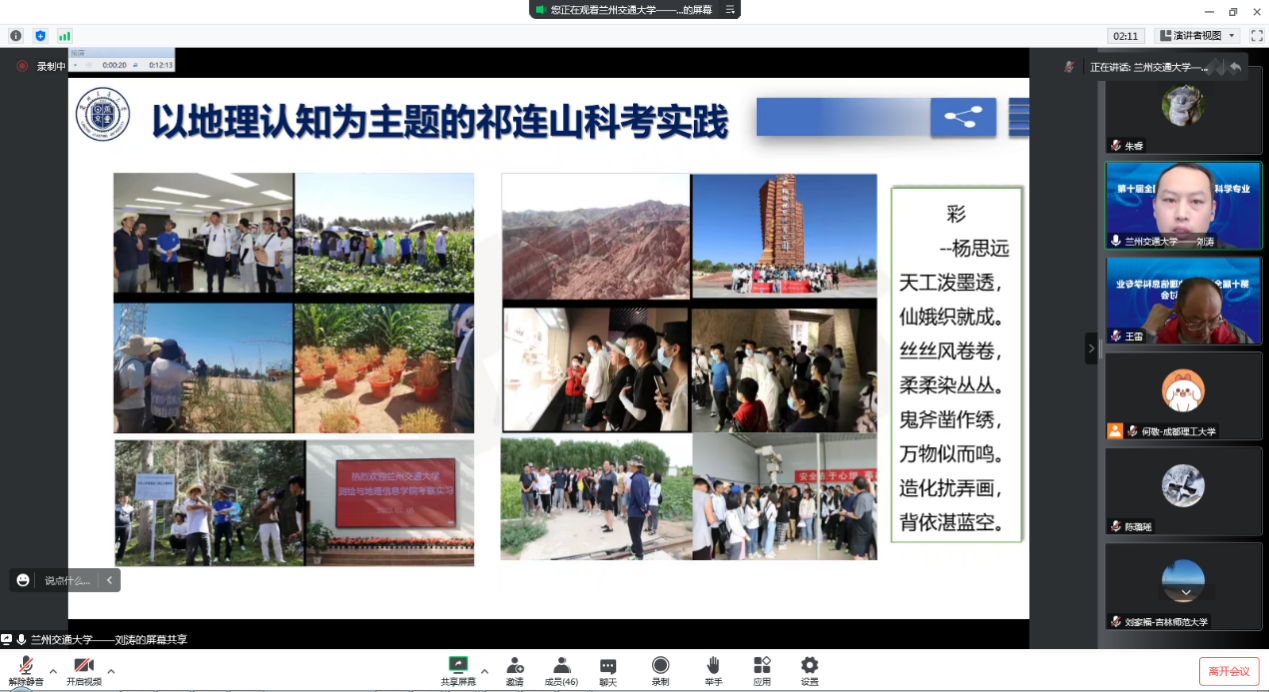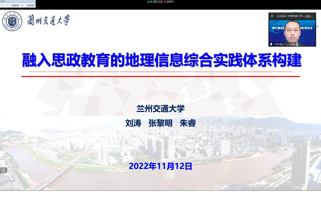 在专题一:地理信息科学专业课程思政建设研讨会中,刘涛教授做了《融入思政教育的地理信息综合实践体系构建》的专题报告。报告中介绍了我院地理信息科学专业以扶贫攻坚为主题的社会实践和以地理认知为主题的祁连山科考实践,并分析了这两个社会实践对思政与专业教育融合的方式,达到润物无声的育人效果。