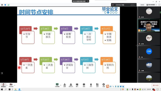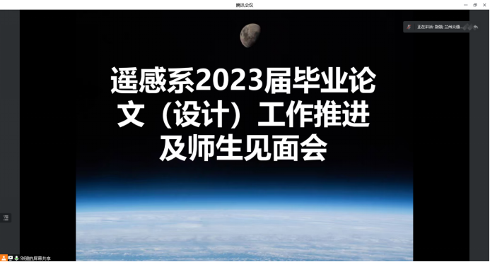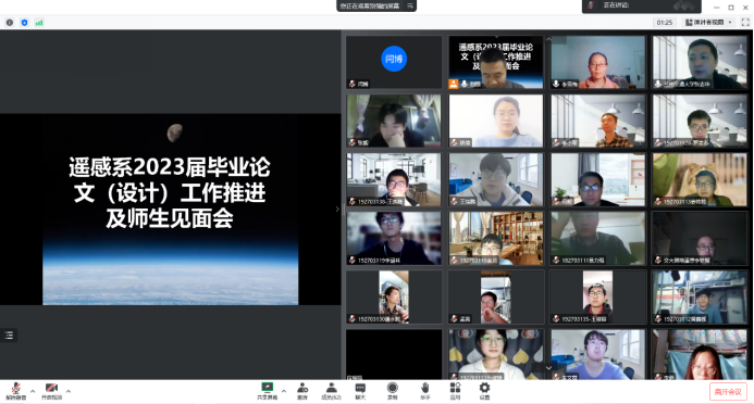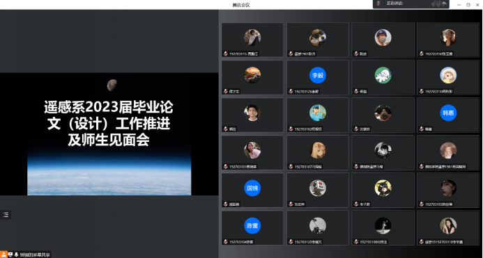 2023届的毕业设计工作已经开始,为提高学生毕业设计质量,确保毕业设计的工作规范与高效进行。测地学院遥感科学与技术系于2022年11月23日在线上举行了“2023届遥感科学与技术毕业设计师生见面会”。遥感科学与技术系主任张志华,毕业设计指导老师:别强,李雪梅,段焕娥,韩惠,庞国锦,何毅,李小军,李轶鲲老师以及2023届遥感科学与技术毕业班全体同学参加此次见面会。