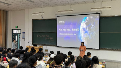 活动第一阶段,上午8:30在2教2201教室由易智瑞技术总监袁慧和薛永杰分别以“GIS无处不在、随处精彩”和“遥感技术发展与应用”为题向师生们做了专题讲座,讲座由地信系副主任朱睿主持。袁慧从大数据分析、人工智能、多源合景等方面介绍了GIS的最新前沿技术和应用案例。薛永杰从国产遥感数据资源、云遥感服务平台等角度介绍了遥感与人工智能、深度学习相结合的成功应用。