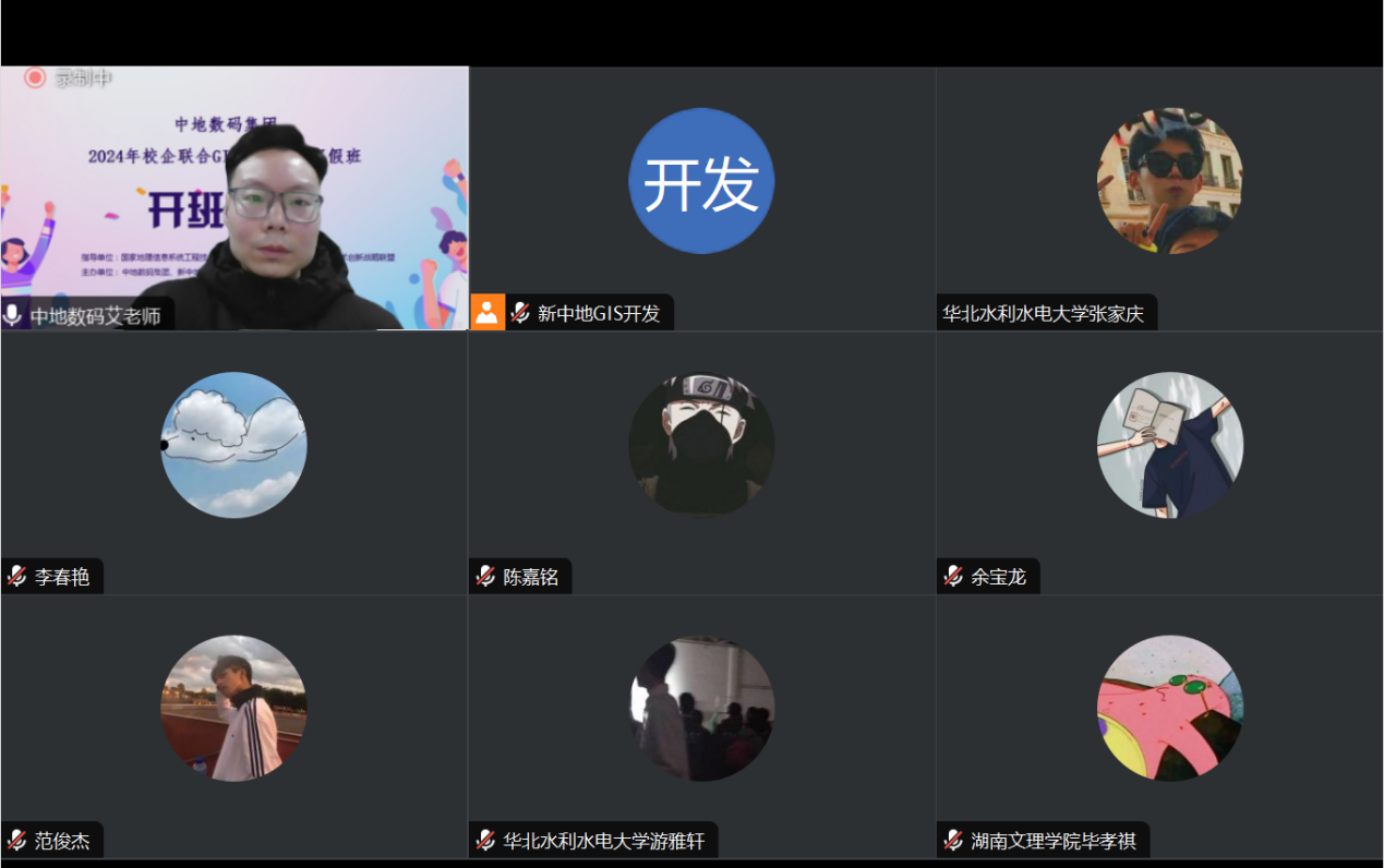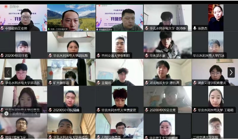 兰州交通大学测绘与地理信息学院副院长刘涛教授、地信系主任张黎明教授,华北水利水大学测绘与地理信息学院地信学科带头人徐艳杰老师,中地数码集团GIS人才培养中心邢影主任,新中地教育高校合作部总监艾伟,新中地教育高级讲师陈家豪,以及全国高校近300名地信学子参加了开班典礼。开班仪式由新中地教育艾伟老师主持。