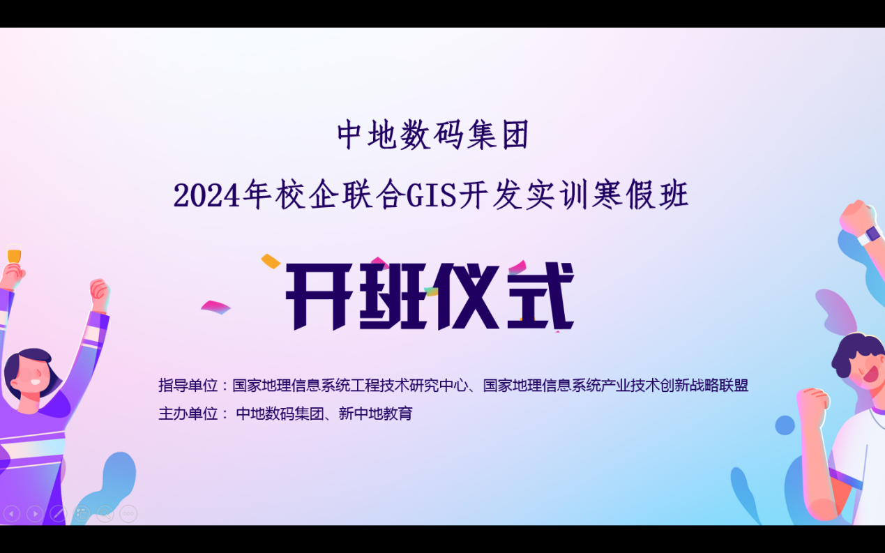 为贯彻落实国家中长期人才战略目标,推动地理信息产业快速发展,培养具有良好职业道德与创新精神的高素质、高技能人才,并积极响应教育部校企协同育人的指导方针,进一步加强校企合作,不断探索创新校企合作模式、丰富校企合作内容,提高创新型、技能型人才培养的针对性和适应性,提升校企合作办学的层次和水平,建立校企长期稳定的组织联系制度,实现合作共赢的目标。2024年1月15日上午9点30分,由兰州交通大学、华北水利水电大学、中国地质大学(武汉)、中国矿业大学、青海大学、西北大学、四川师范大学、阜阳师范大学、湖南文理学院等15所高校地信院系参与并联合中地数码集团以及新中地教育共同开展的校企联合GIS开发实训开班典礼,在主会场武汉中地科技园线上联动各高校学子云端举行。