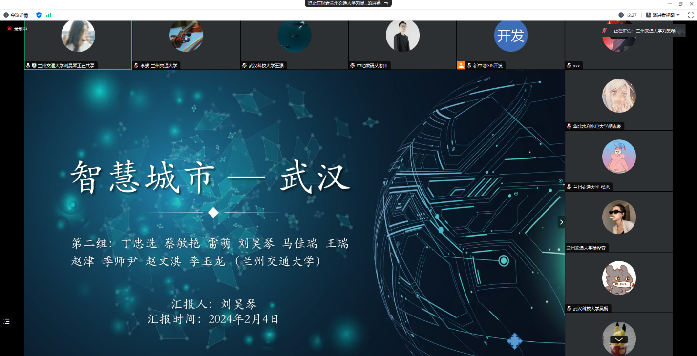 2月4日上午,举办了兰州交通大学学生的结课答辩专场。此次答辩的评委组由中地数码集团新中地教育组织者艾伟老师、中地数码集团新中地教育高级讲师陈家豪老师,西南交通大学的郭永欣博士、我院刘涛副院长和地理信息科学系的李赟老师组成。我院共有5组学生展示了他们的项目成果,并接受了专家们的点评。