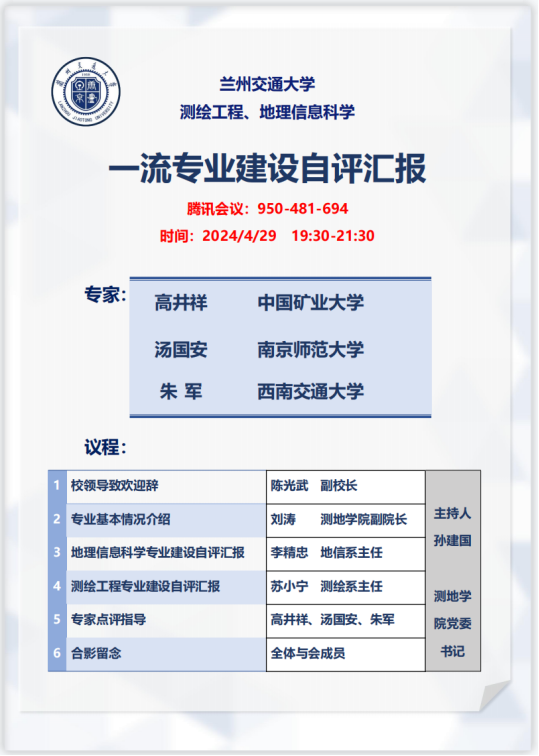 4.29日晚,我校线上召开了地理信息科学、测绘工程国家级一流本科专业建设点自评会。副校长陈光武出席,测绘与地理信息学院领导班子、各系室负责人、专业负责人和教师代表参加了会议。会议旨在为地理信息科学、测绘工程专业发展把脉问诊,扎实推进专业内涵建设,提升专业发展质量。