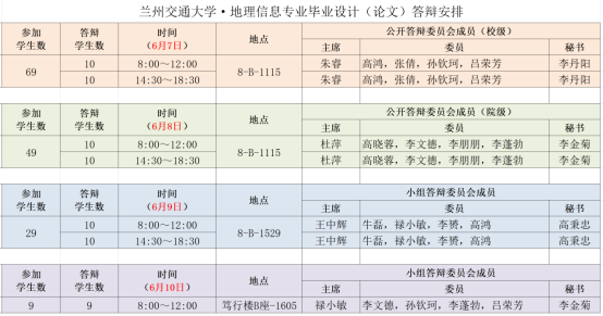 2025年6月7号至6月10号,学院地理信息科学专业开展了2025届毕业设计(论文)答辩。本次答辩涉及地理信息科学专业01班与02班(基地班)共69名学生,其中6.7-6.8两天分别为校级和院级公开答辩,6.9-6.10两天为小组答辩。