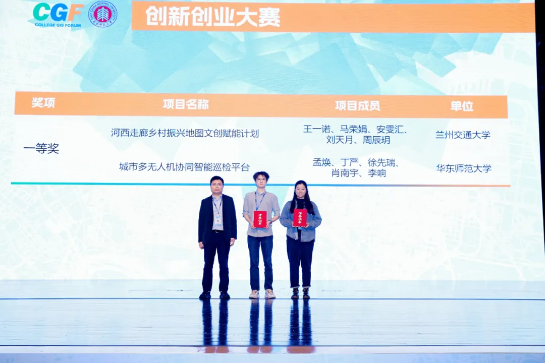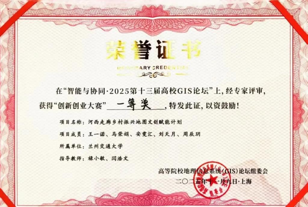 2025年11月7-9日,由华东师范大学、武汉中地数码科技有限公司联合承办的2025第十三届高校GIS论坛在上海成功举行。由禄小敏老师担任指导教师,拾光地图创研社团队成员王一诺、马荣娟、安雯汇、刘天月和周辰玥组成的参赛队伍项目《河西走廊乡村振兴地图文创赋能计划》荣获论坛创新创业大赛一等奖。这也是团队成员第二次获得该论坛创新创业大赛一等奖。