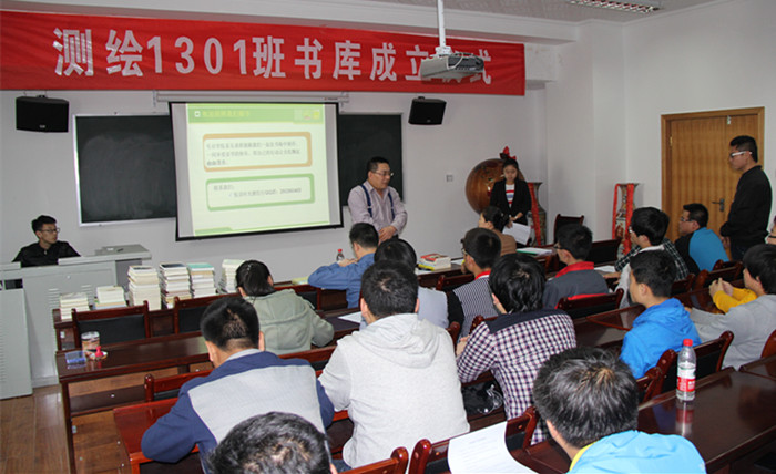 417日下午,测绘1301班在学院学术厅举行了班级书库成立仪式。出席活动的特邀嘉宾有测地学院书记李仲勤、学生办公室主任兼测绘1301班班主任李艳梅和团委书记曹铎。