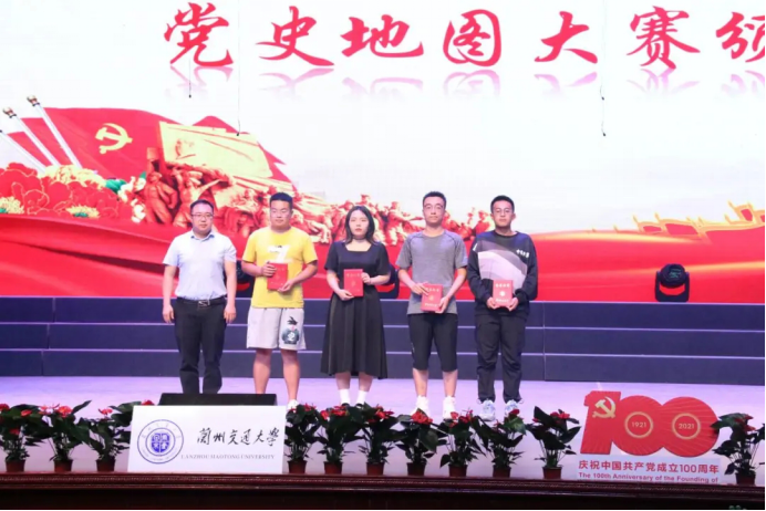 正值建党一百周年之际,毕业晚会共分“破晓•开天辟地”、“砥砺•继往开来”、“奋进•百年复兴”三个篇章。晚会进行中,举行了学校党史地图大赛颁奖和学院“测地之星”奖学金颁奖仪式。由学院党委书记陈喜春老师公布党史地图大赛获奖人员名单并为其颁奖;由学院闫浩文院长公布测地之星获奖人员名单并与广州中海达测绘科技有限公司甘肃分公司总经理马子龙先生、区域经理孙仓先生、广州南方测绘集团兰州分公司副总经理刘利天先生共同为学院的各位优秀学子颁发了荣誉证书并合影留念。