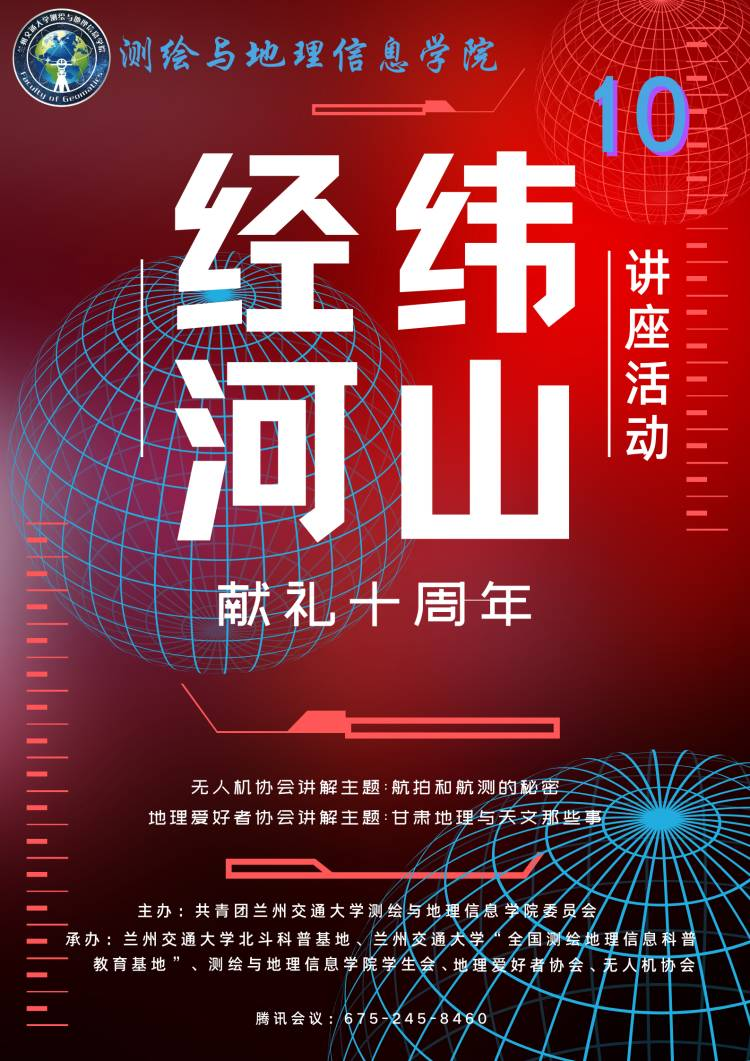 为了丰富在校大学生的校园生活,进一步落实地理信息和无人机相关知识的传播,推进社团工作进行,共青团兰州交通大学测绘与地理信息学院委员会联合兰州交通大学北斗科普基地、兰州交通大学“全国测绘地理信息科普教育基地”、测绘与地理信息学院学生会、“地理爱好者协会”和“无人机协会”在10月1日晚7:30于腾讯会议软件举办“经纬河山,献礼十周年”在线科普讲座。